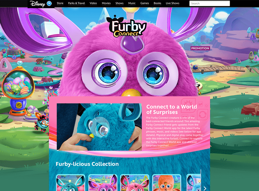 I designed and built the website for the Furby Connects partnership. At the time Disney was using a CMS system called ‘ Materhorn’ which is part of a Drupal-based CMS system. Using my extensive knowledge of the technology and its capabilities I reworked every element of the page to make it fully in tune with ‘Furby’.